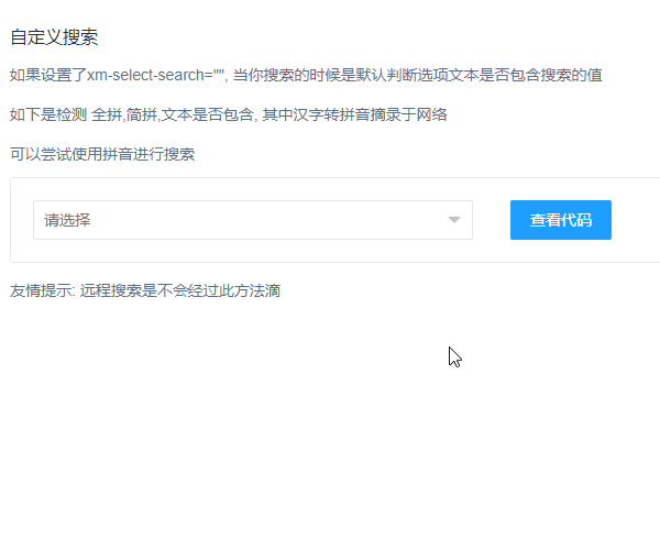 xm-select-search 本地搜索 & 远程搜索 xm-select-search, xm-select-search="/search", 值为空时已有条目过滤搜索, 有值时开启远程搜索