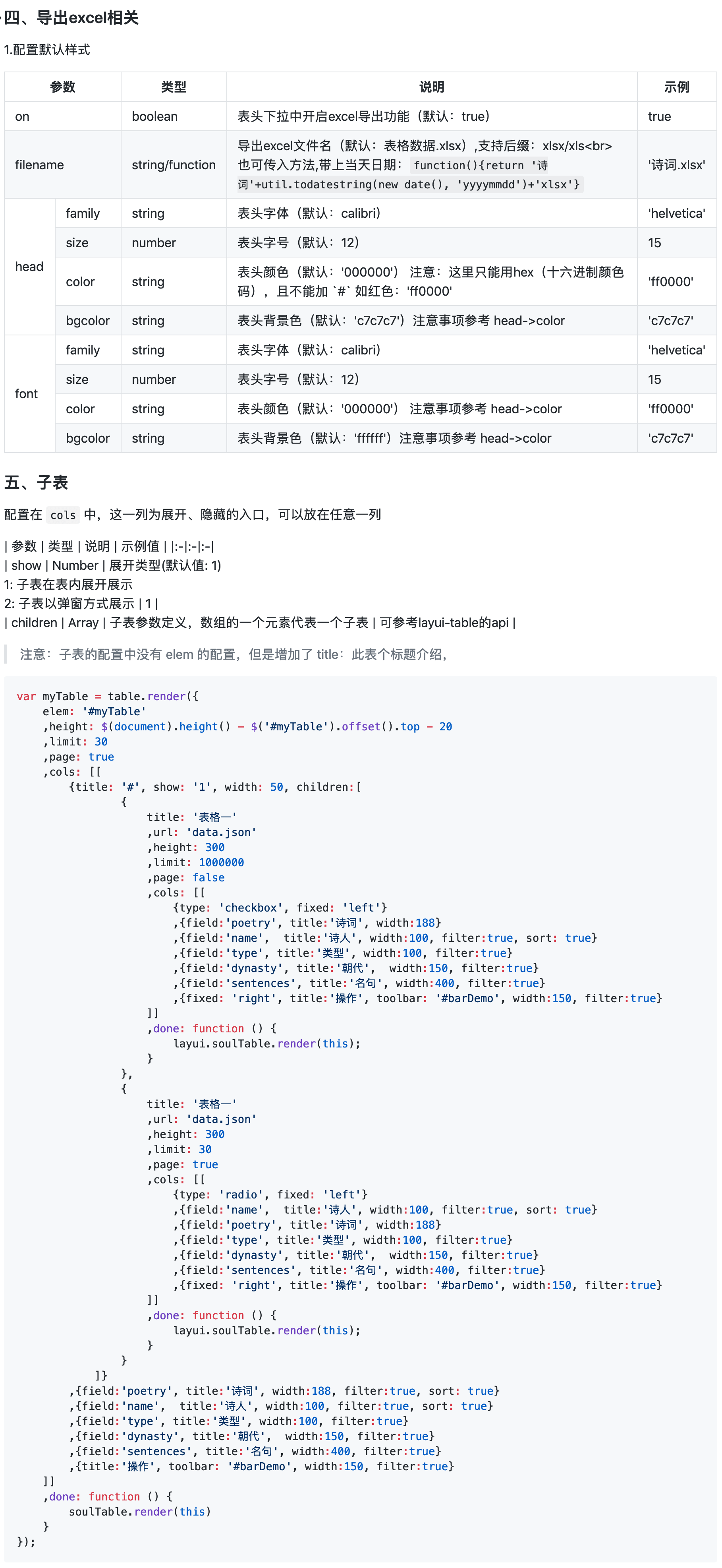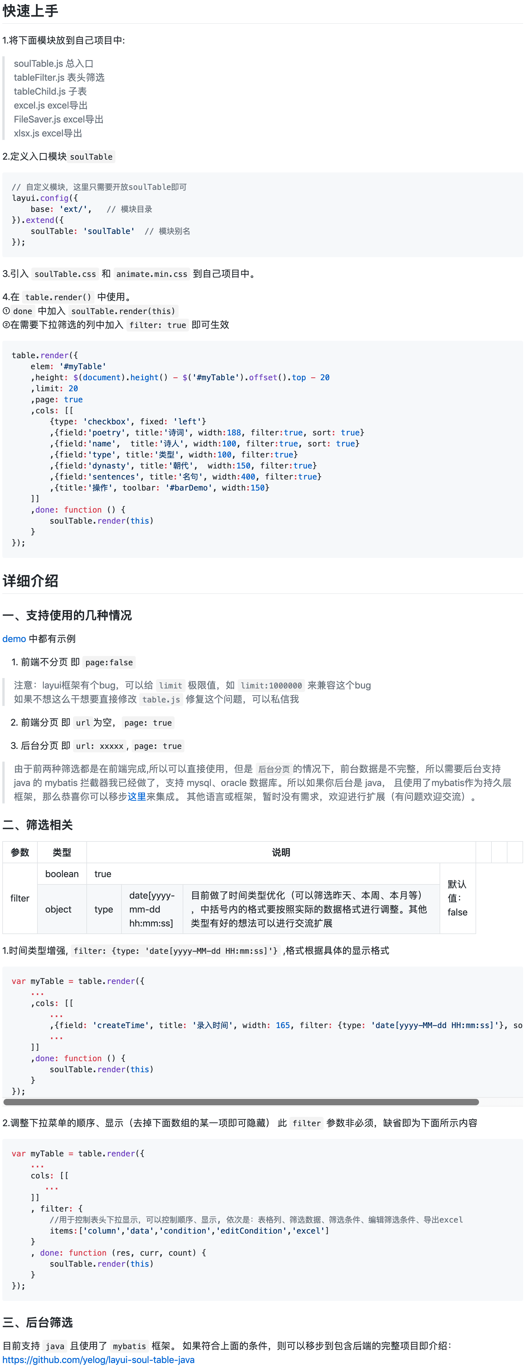 功能点: 1. 表头筛选、自定义条件(支持前台筛选、后台筛选[mysql|oracle]) 2. 拖动列调整顺序、隐藏显示列 3. excel导出(根据筛选条件和列顺序导出) 4. 子表(表中表、无限层级、子表同样支持前3个功能)