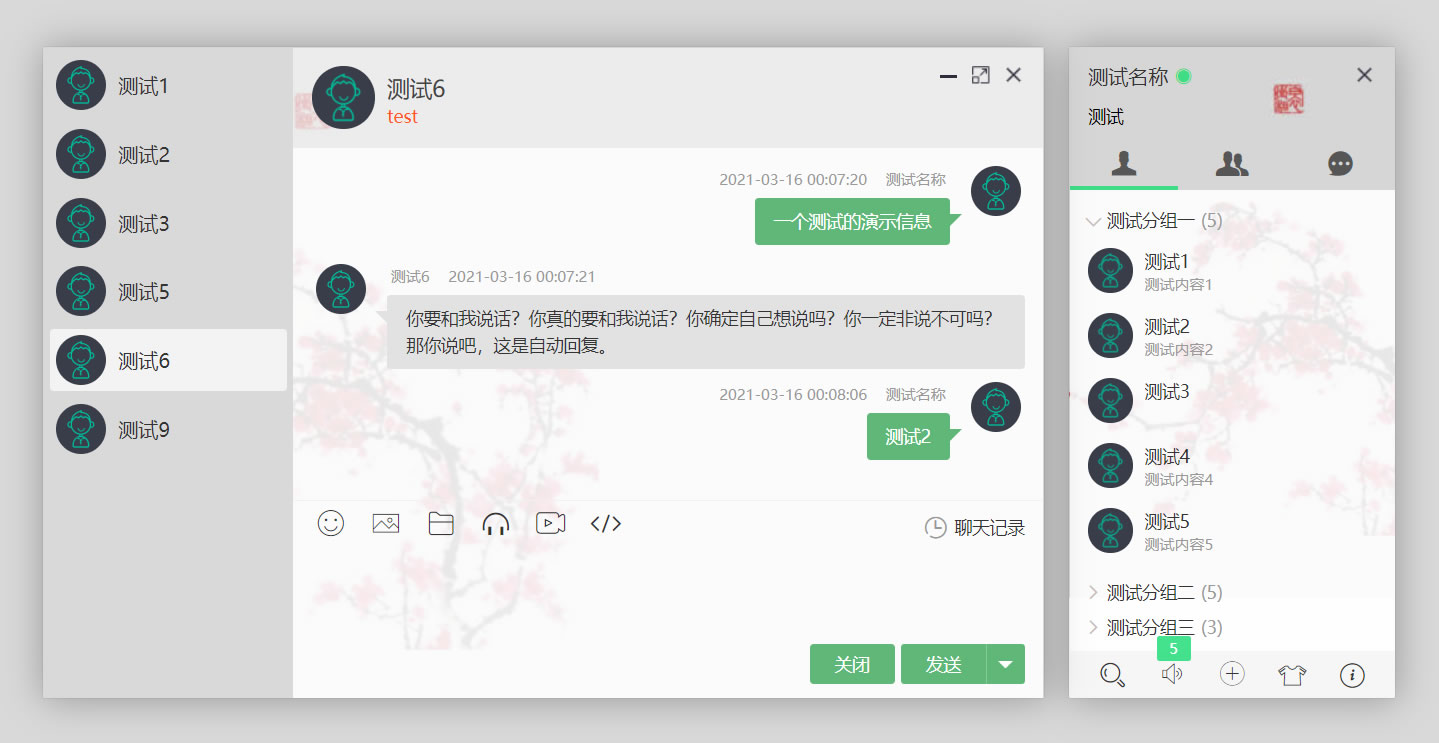 聊天面板最大化/右下角调整尺寸、移动端会话面板适配(含全新的聊天内容时间展示)、自定义工具栏、消息桌面提醒/声音提醒、添加好友/群组的弹出面板、消息盒子/聊天记录的内置模版、最新系统消息机制、主面板修改签名、好友会话状态刷新、系统消息展示、群聊成员私聊、好友置灰和取消。