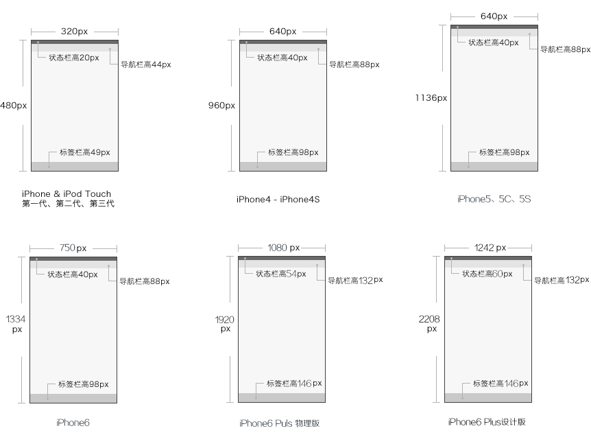 | 设备 | 尺寸 | 分辨率 | 状态栏高度 | 导航栏高度 | 标签栏高度 |